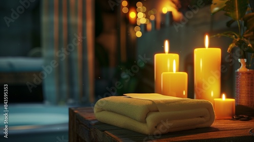 A set of aromatic candles and fresh towels neatly arranged in a spa room.