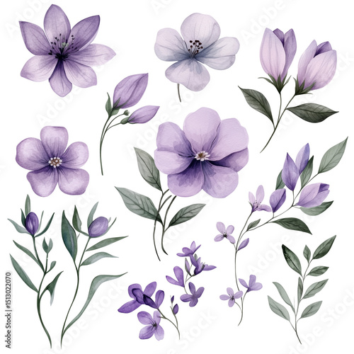 A set of hand-drawn watercolor flowers, featuring a soft purple hue and natural green leaves, isolated on a transparent background (18)