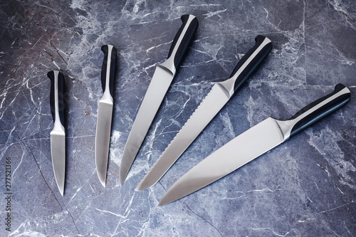 A set of knives - cook, universal, for bread, for cutting and for cleaning. Knives lie on a dark gray background. The blades are made of stainless steel. The concept of selection of kitchen utensils.