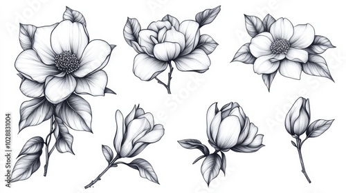 A set of magnolia flowers and leaves in a tattoo style, elegantly arranged in black and white with intricate scratchboard-style engraving.
