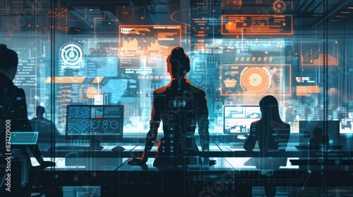 A set of silhouettes depicting business professionals working in a high-tech office environment. One person is using a touchscreen monitor, another is interacting with a holographic display, and a