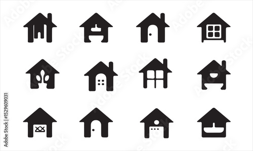 A set of twelve simple, black silhouette icons of houses with various architectural details, house icon, home icon, building icon, real estate icon, property icon, architecture icon, silhouette, black