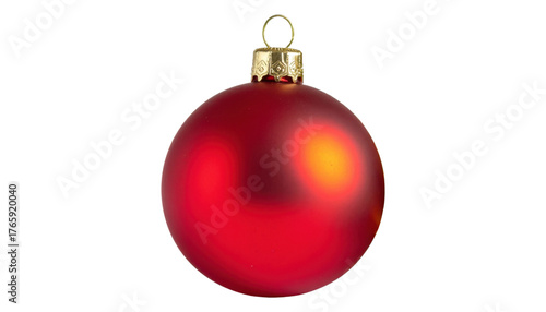 A shiny red christmas ornament with a gold top and hanging loop, viewed from the front, isolated on white