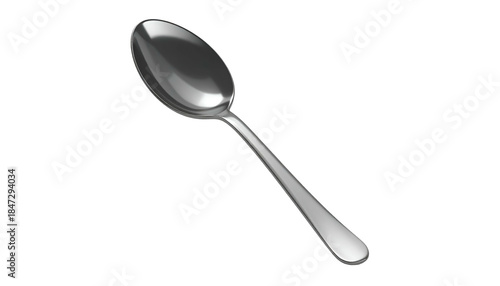 A shiny silver spoon on a black background, angled diagonally. The bowl reflects light