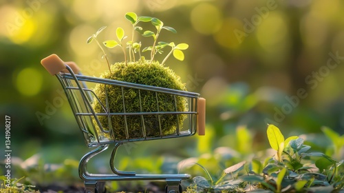 A shopping cart filled with a moss-covered ball and budding plants symbolizes eco-friendly choices and sustainability in shopping.