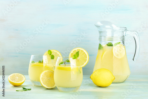 A side view of homemade lemonade in glasses and a pitcher, with fresh lemons and mint, on a teal background with copy space