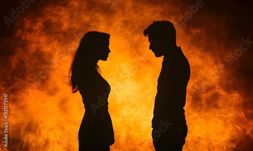 a silhouette of a couple facing each other against a fiery background.