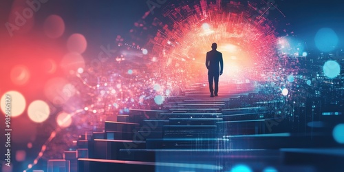 A silhouette of a figure walking towards a vibrant, abstract portal filled with colorful lights and patterns, symbolizing exploration.