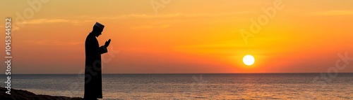 A silhouette of a Muslim standing on a hill or by the ocean at sunset, facing the horizon in prayer