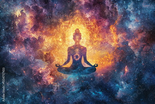 A silhouette of a person meditating, surrounded by a vibrant, cosmic nebula, symbolizing inner peace and universal connection.
