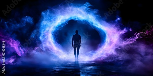 A silhouette of a person stands before a swirling, colorful portal surrounded by mist and ethereal light effects. Concept Silhouette Art, Colorful Portal, Ethereal Light Effects, Mystical Atmosphere