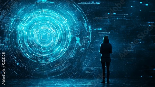 A silhouette of a woman standing before a futuristic digital interface, illuminated in blue tones, symbolizing technology and innovation.