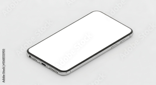 A silver smartphone with a blank white screen displayed on a white surface in a simple studio shot