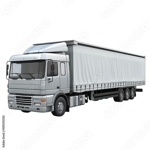 A silver truck with a large covered cargo area, set against a black background, showcasing its robust design and functionality.