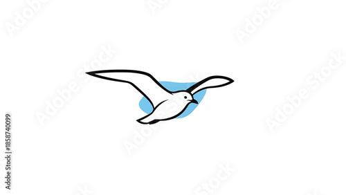 A simple, bold illustration of a flying white bird with black outlines and a light blue shape behind it