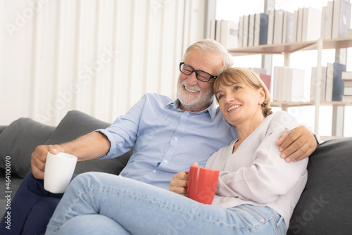 A simple day of a retired couple. Mature couple sitting in the living room and drink coffee.