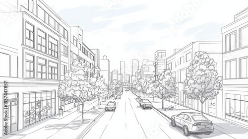 A simple drawing of a city street: buildings, roads, trees, cars, and people walking.