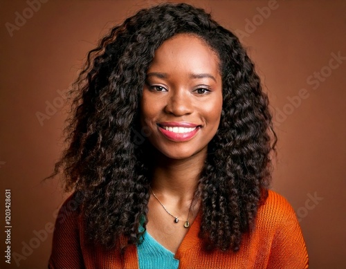 A simple portrait of a Black woman smiling confidently, with natural hair, wearing a casual top.