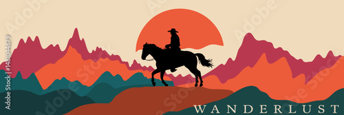 A simple vector illustration of a cowboy riding a horse in the sunset, with a mountains background