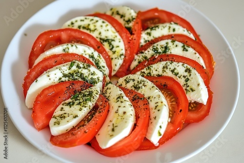 A simple yet elegant dish featuring sliced tomatoes and mozzarella on a white plate