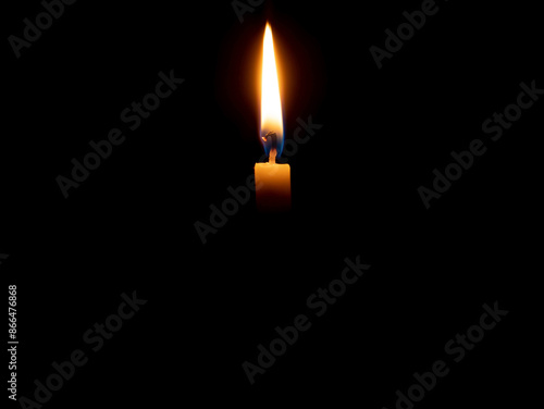 A single burning candle flame or light glowing on an orange candle on black or dark background on table in church for Christmas, funeral or memorial service with copy space