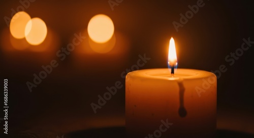 A single candle illuminates a dark space, casting warm light on a serene scene.
