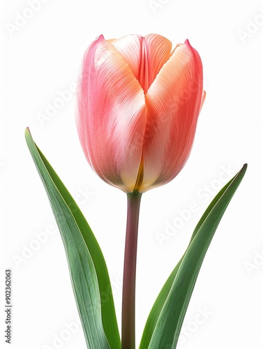 A single, delicate pink and white tulip with a yellow center, isolated on a white background.