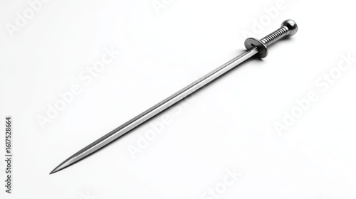 A single, perfectly lit 4K photorealistic image of a steel sharpening rod, with a handle, simple and functional design, isolated on a pure white background. Soft, diffused lighting to show textured