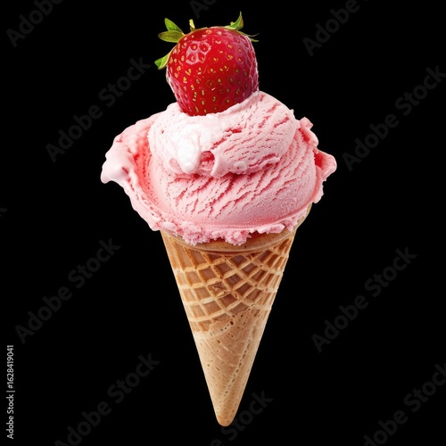 A single scoop of pale pink strawberry ice cream sits atop a crisp waffle cone, garnished with a fresh strawberry