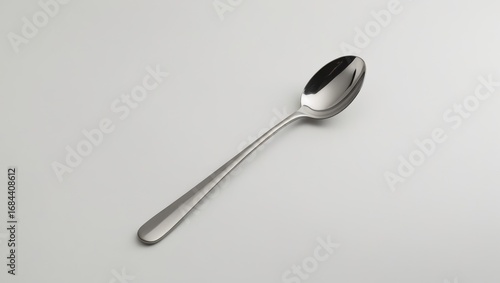 A single stainless steel spoon sits elegantly on a plain white surface, showcasing its smooth, reflective qualities.