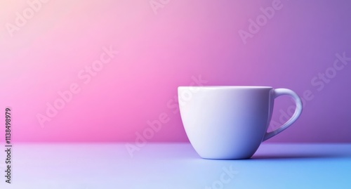 A single white mug sits on a pastel surface