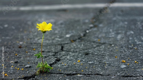 A single yellow flower grows through a crack in the asphalt. The scene highlights resilience and nature's ability to thrive in urban environments.