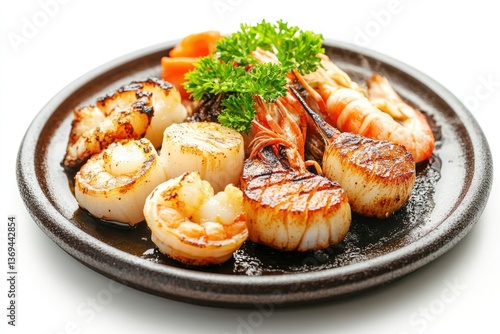 A sizzling plate of Japanese teppanyaki seafood, featuring fresh scallops and shrimp, perfectly grilled, isolated on a white background.