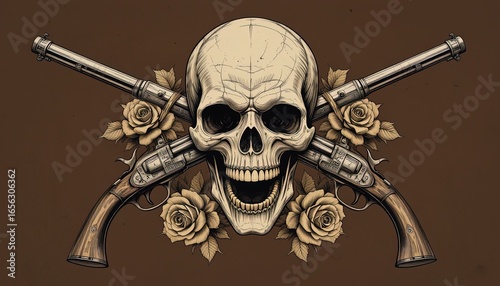 A skull adorned with antique firearms and delicate roses, creating a captivating and intricate design.