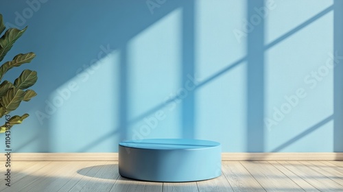 A sky blue pedestal on a wooden floor against background with window shadow