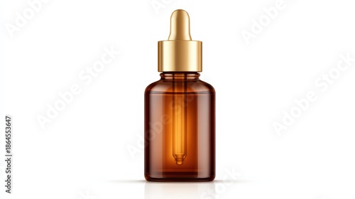 A sleek amber glass dropper bottle with a golden cap, often used for essential oils or serums, reflecting a clean and modern design.