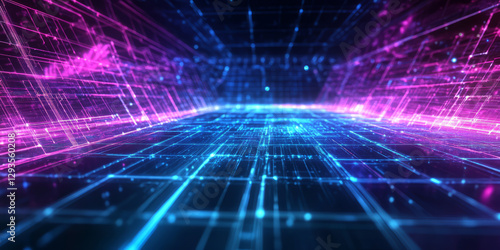 A sleek and elegant abstract background with glowing, tessellated cybernetic fractals, seamlessly forming an infinite neon grid. The futuristic geometric precision and radiant neon hues evoke digital