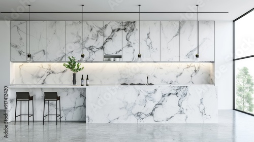 A sleek and modern kitchen featuring polished white marble countertops and cabinets with subtle black veining, perfectly lit in a minimalist design.