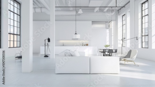 A sleek and modern loft apartment boasting a pristine white canvas backdrop, Minimalist furnishings arranged for functionality and style, Contemporary minimalist style
