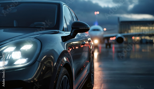 A sleek black car parked at an airport terminal, ready for an exciting journey.