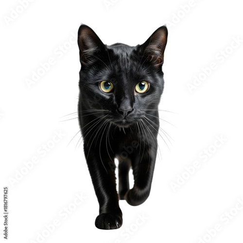 A sleek black cat walks forward isolated on transparent background, looking at camera