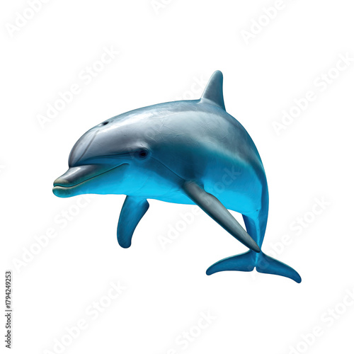 A Sleek Dolphin Leaping Out of Water with Blue Hues and Water Droplets Against a Black Background
