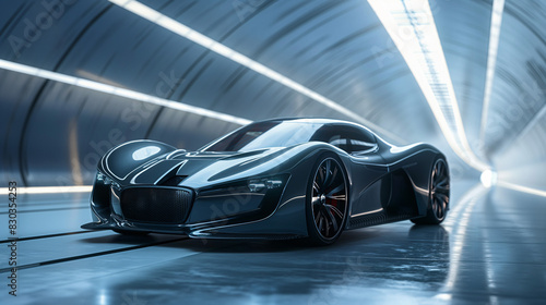 A sleek, high-tech car moves through a futuristic tunnel with vibrant neon lights, embodying the essence of advanced technology and innovation