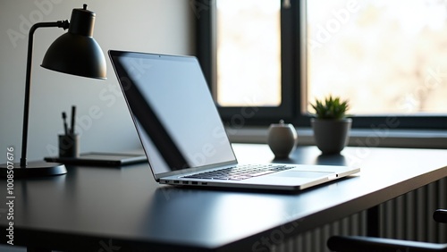 A sleek laptop sits on a minimalist desk alongside a smartphone and plants, with large windows revealing a vibrant cityscape in daylight.