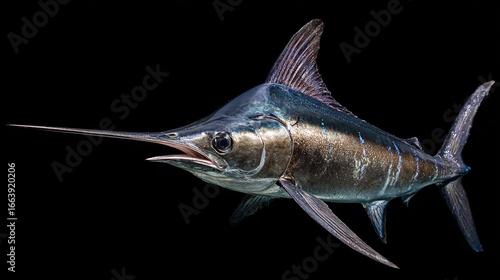 A sleek, majestic ocean predator with a long, pointed bill, dark scales, and prominent dorsal fin against black