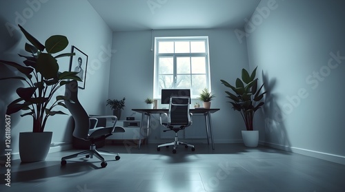 A sleek, modern home office featuring a transparent AI-powered computer, ergonomic furniture, and lush indoor plants