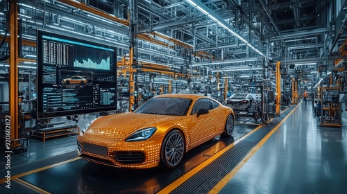 A sleek orange electric car prototype is showcased in a bustling automotive factory filled with advanced technology and machinery