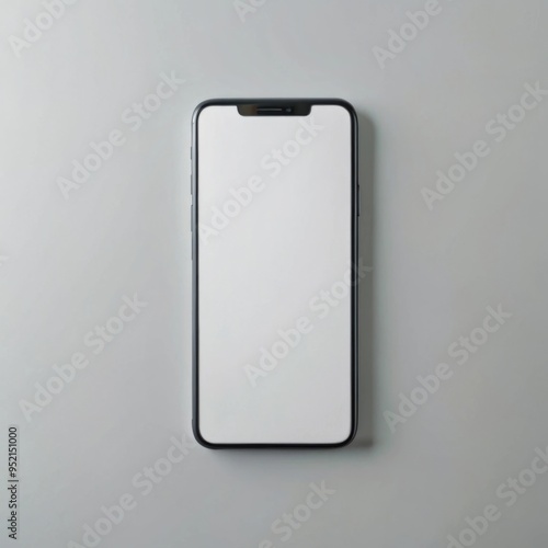 A sleek smartphone with a black frame and a blank white screen lies flat on a minimalist, light grey surface.