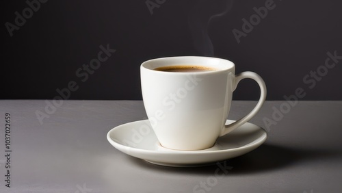 A sleek white cup holds freshly brewed coffee on a matching saucer against a smooth gray background. The scene captures a tranquil coffee moment.