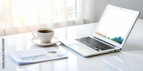 A sleek workspace with a laptop financial documents and a cup of coffee on a glossy white desk captured with a smooth pan to highlight productivity. concept as Showcases a modern workspace setup empha